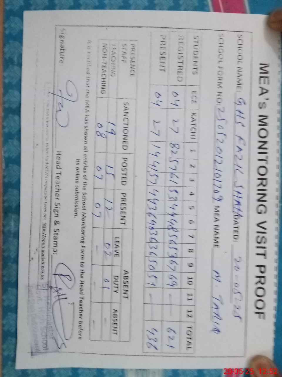 | Attendance Register | Head Teacher | MEA with School | Visit Proof |