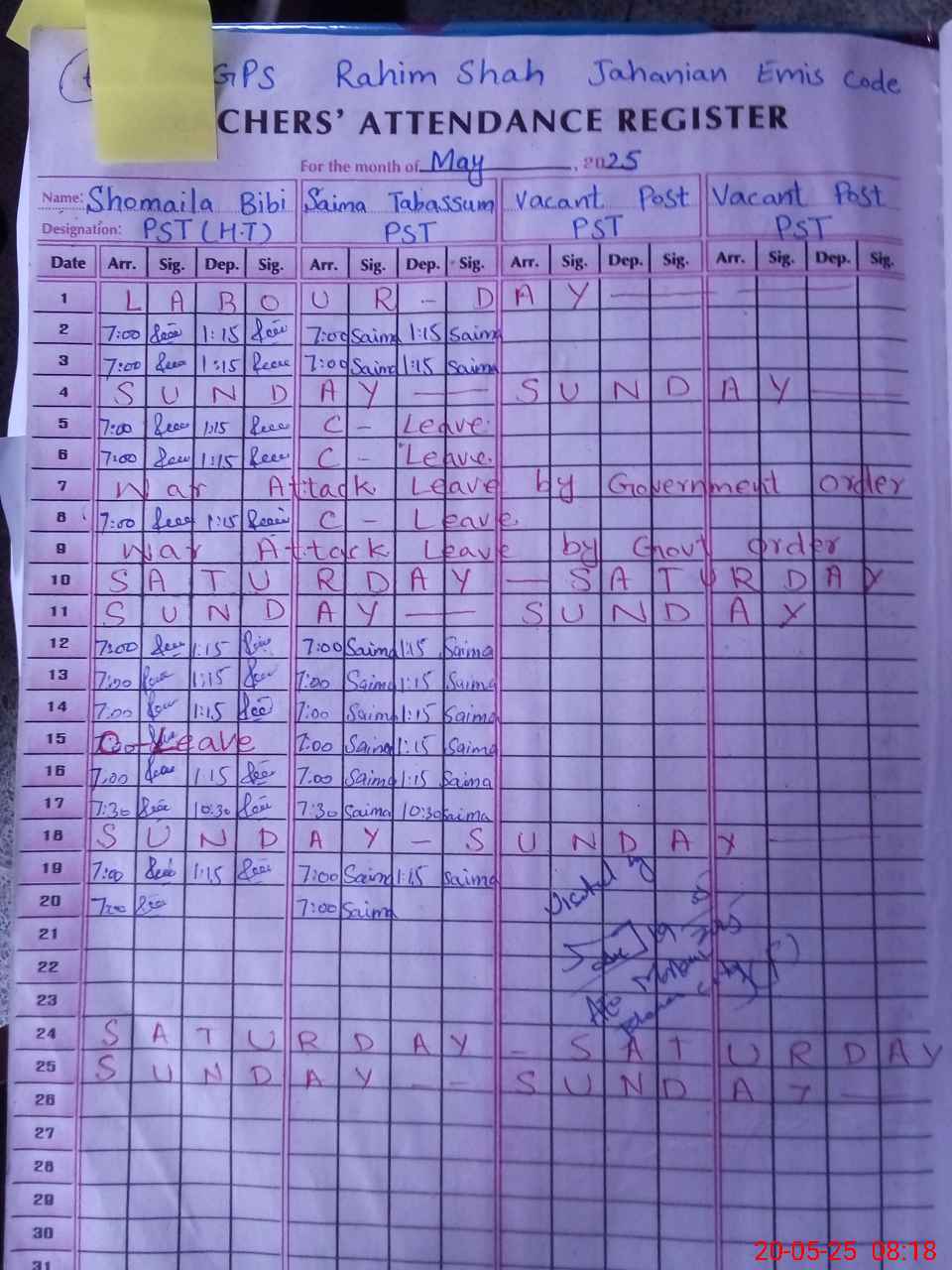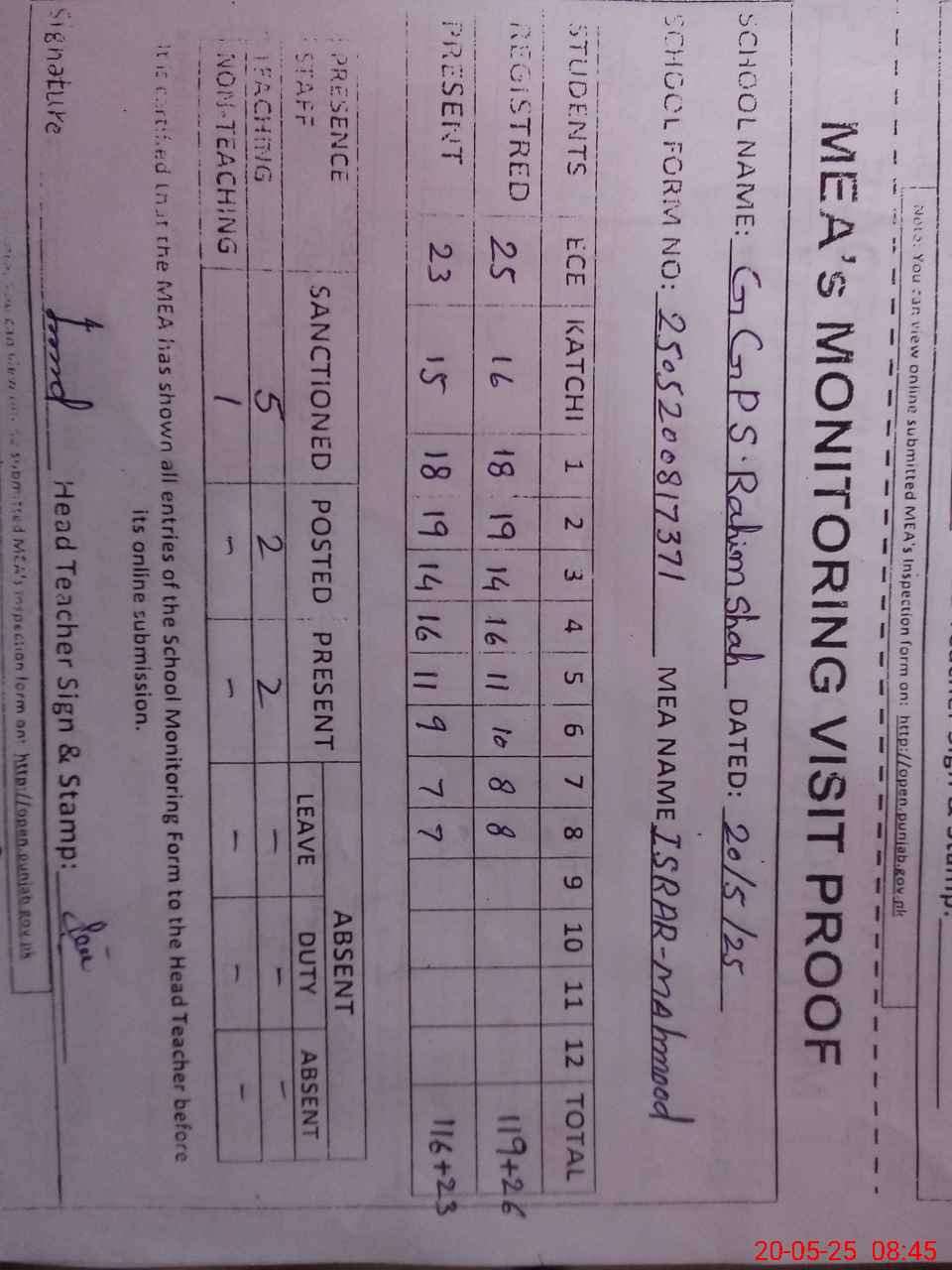 | Attendance Register | Head Teacher | MEA with School | Visit Proof |