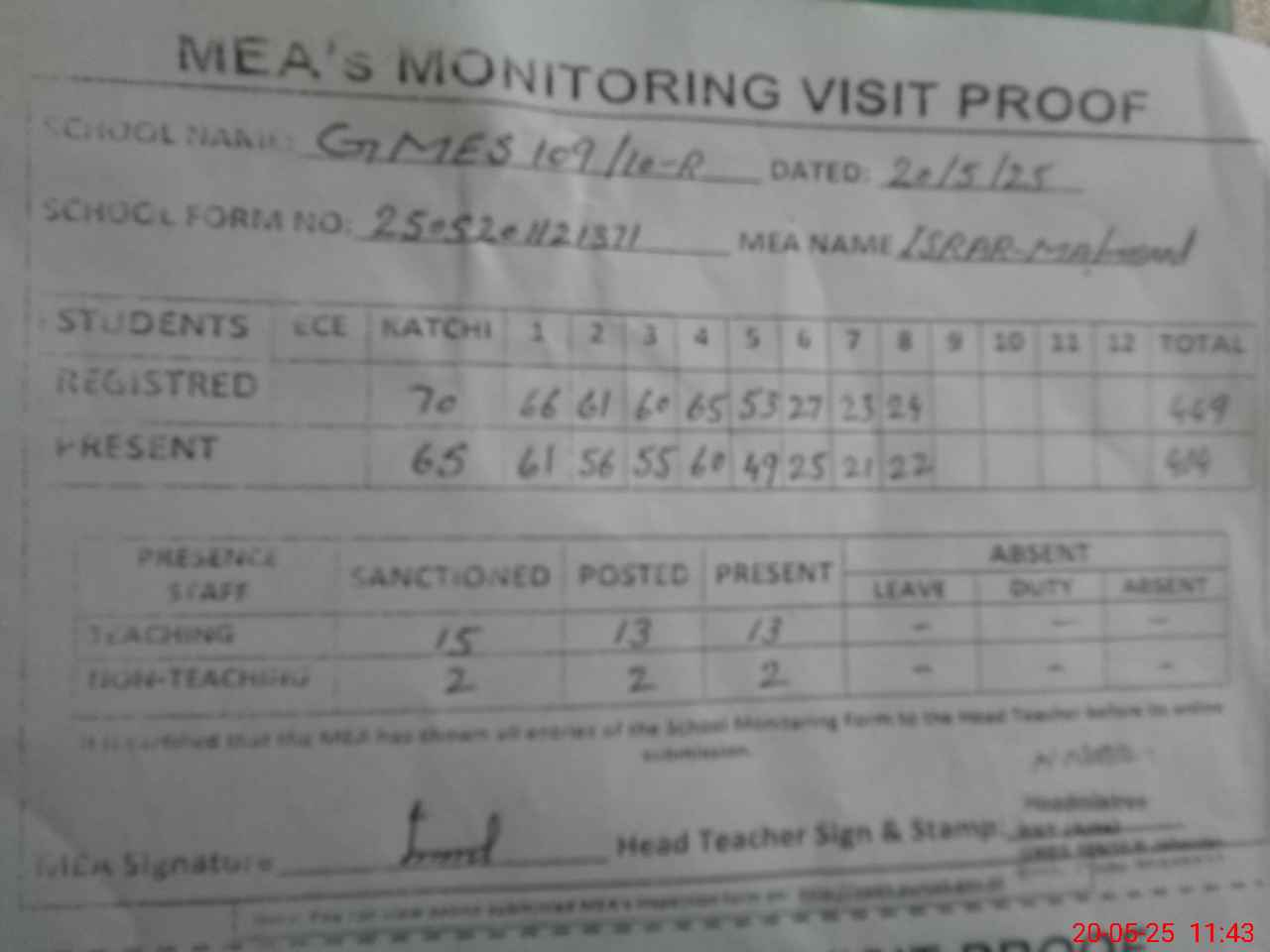 | Attendance Register | Head Teacher | MEA with School | Visit Proof |