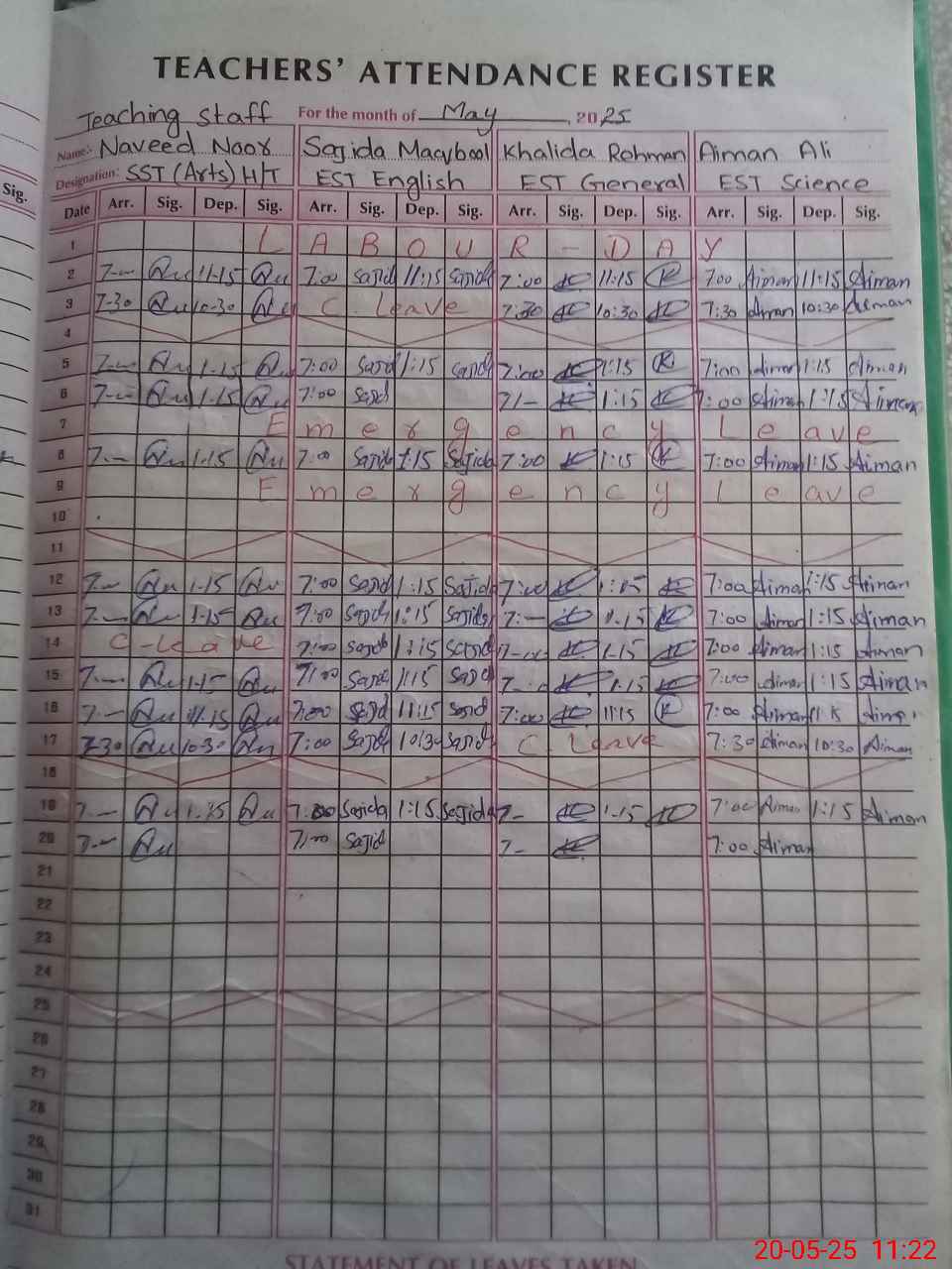 | CNIC | Full Name | Designation | R/C | Absence During Last Calender Month |