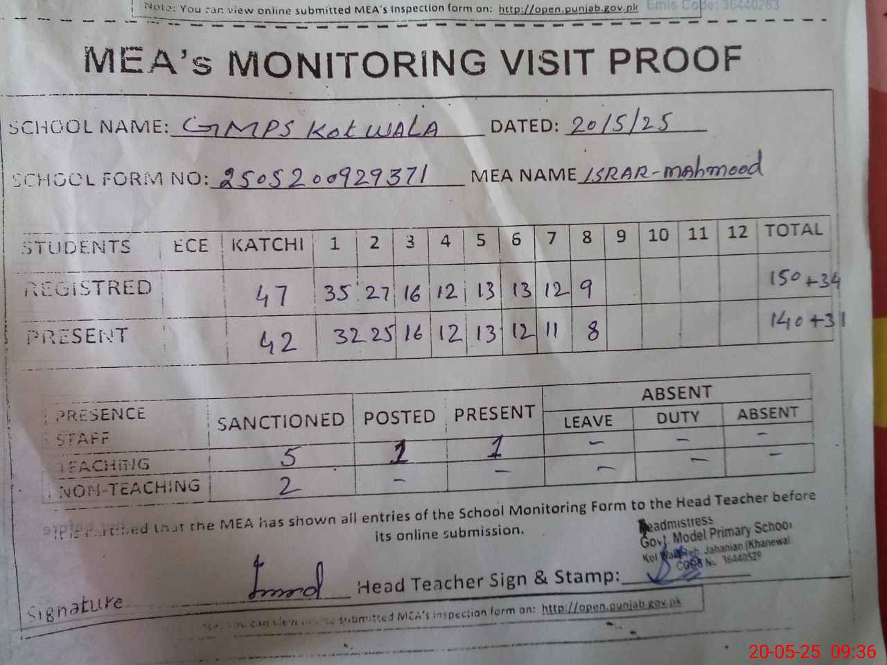 | Attendance Register | Head Teacher | MEA with School | Visit Proof |