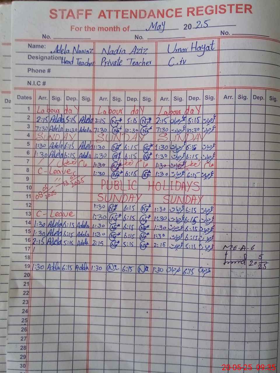 | CNIC | Full Name | Designation | R/C | Absence During Last Calender Month |