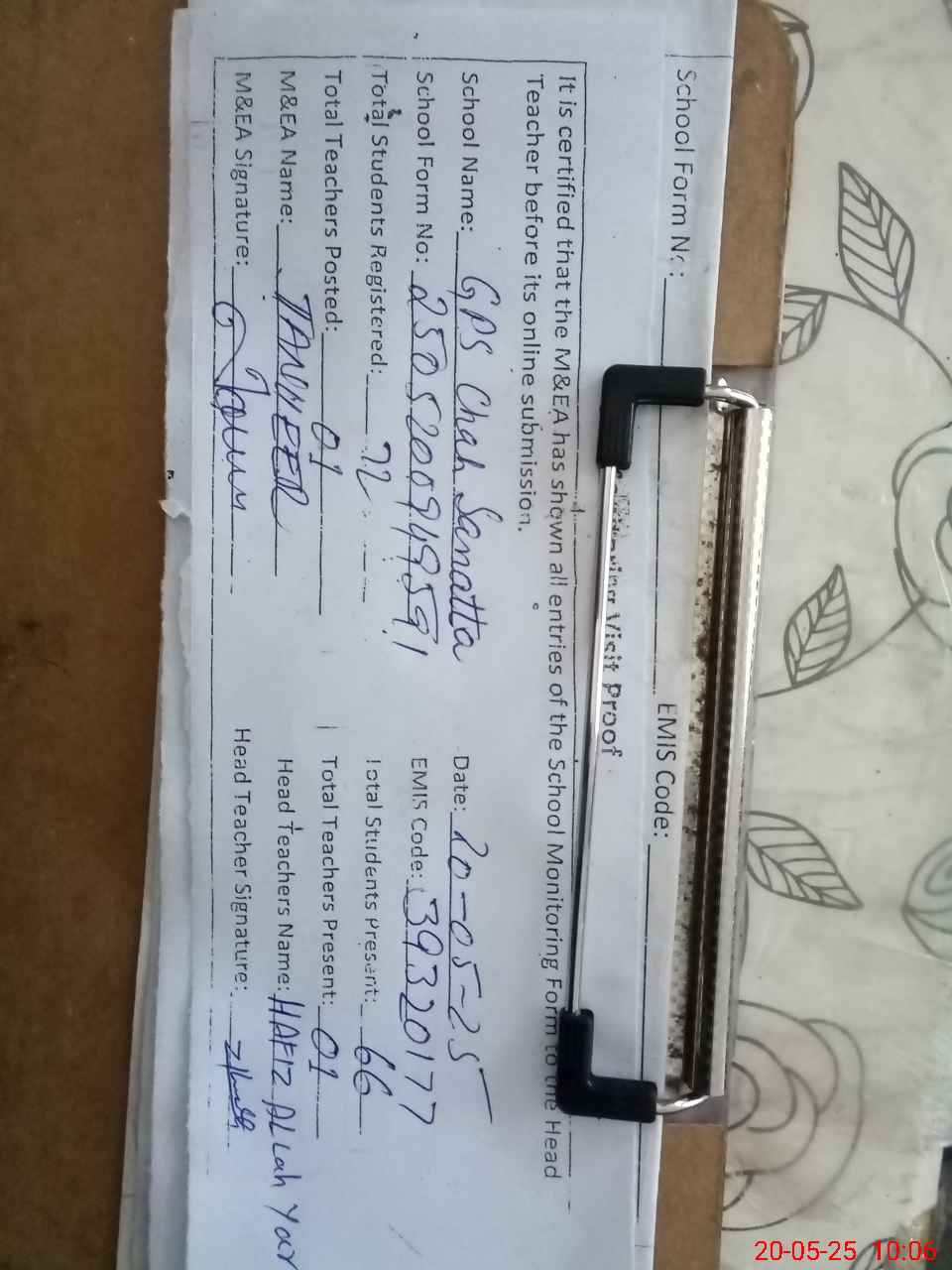 | Attendance Register | Head Teacher | MEA with School | Visit Proof |