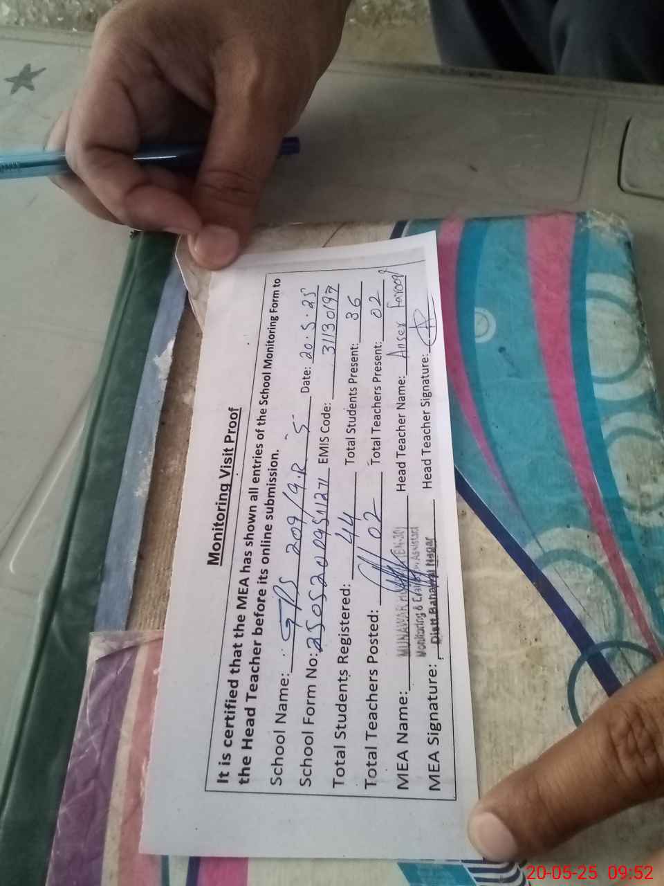 | Attendance Register | Head Teacher | MEA with School | Visit Proof |