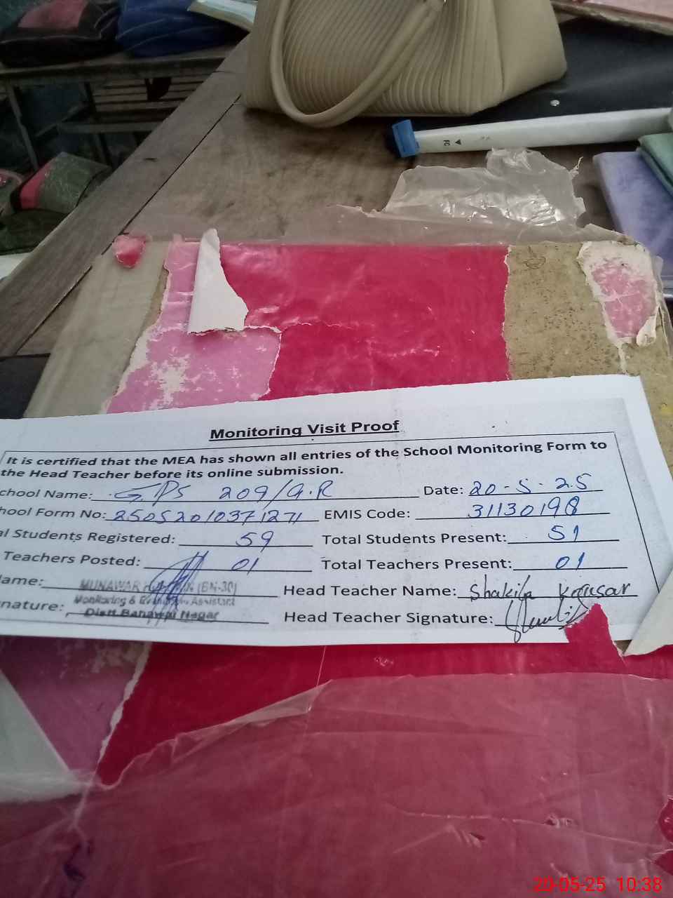 | Attendance Register | Head Teacher | MEA with School | Visit Proof |