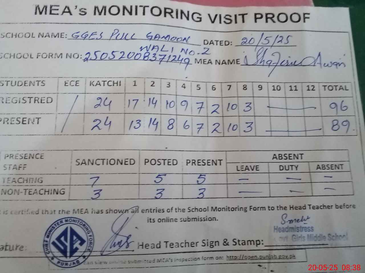 | Attendance Register | Head Teacher | MEA with School | Visit Proof |