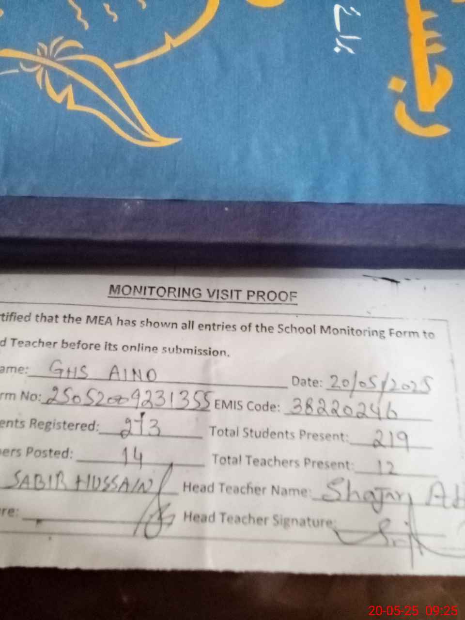 | Attendance Register | Head Teacher | MEA with School | Visit Proof |