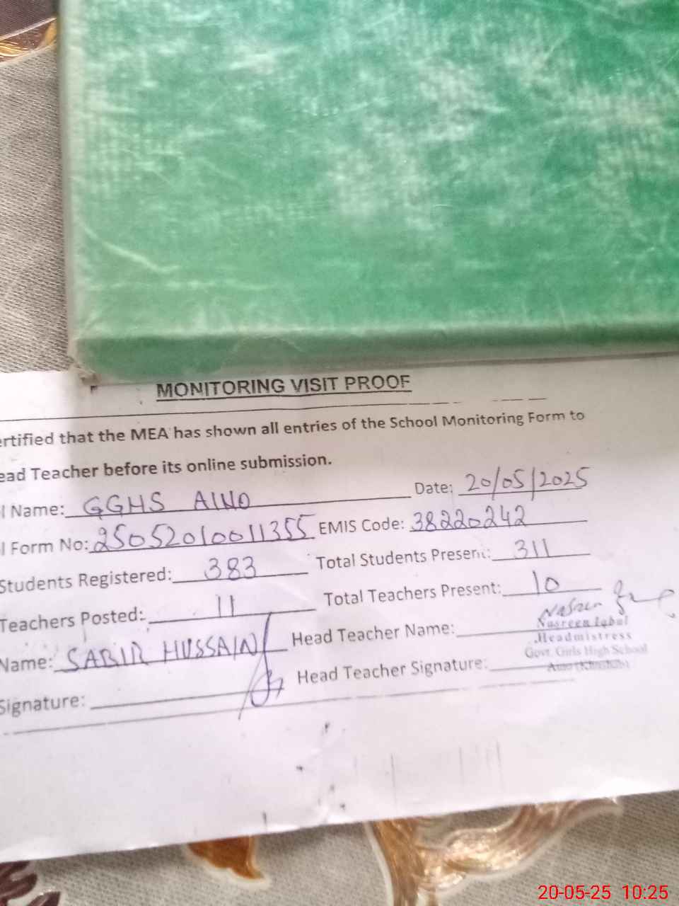 | Attendance Register | Head Teacher | MEA with School | Visit Proof |