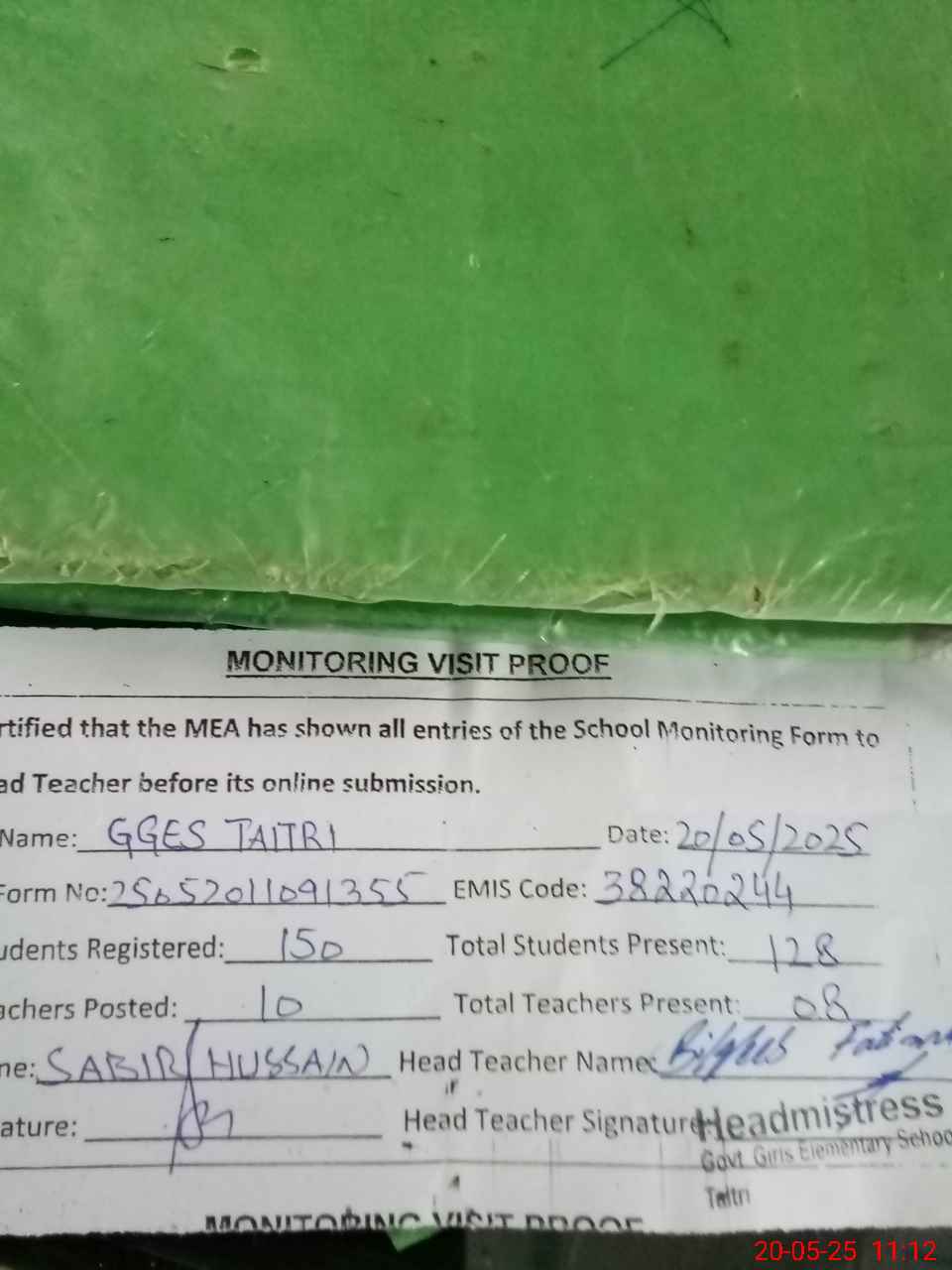 | Attendance Register | Head Teacher | MEA with School | Visit Proof |