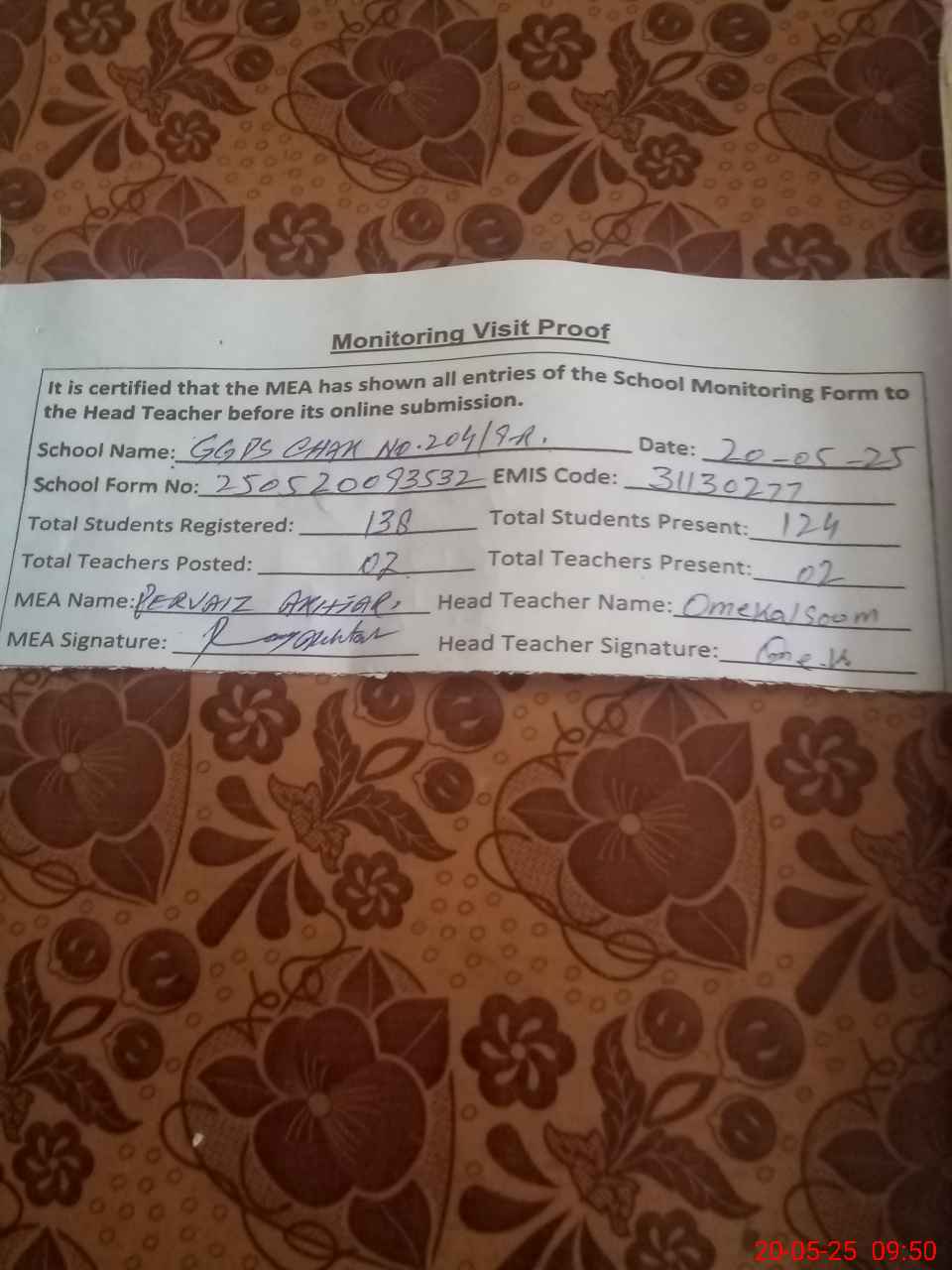 | Attendance Register | Head Teacher | MEA with School | Visit Proof |