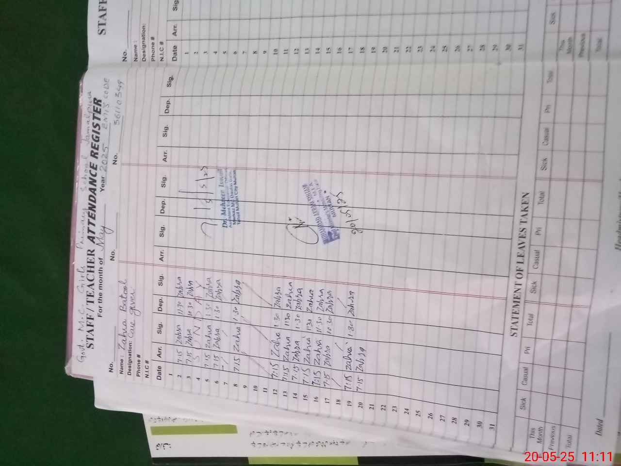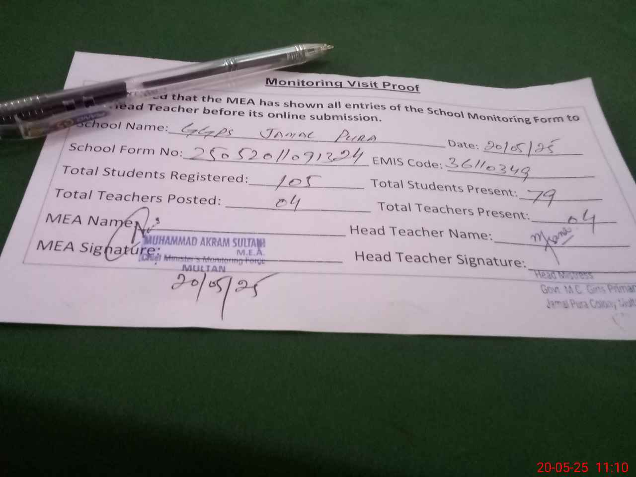| Attendance Register | Head Teacher | MEA with School | Visit Proof |