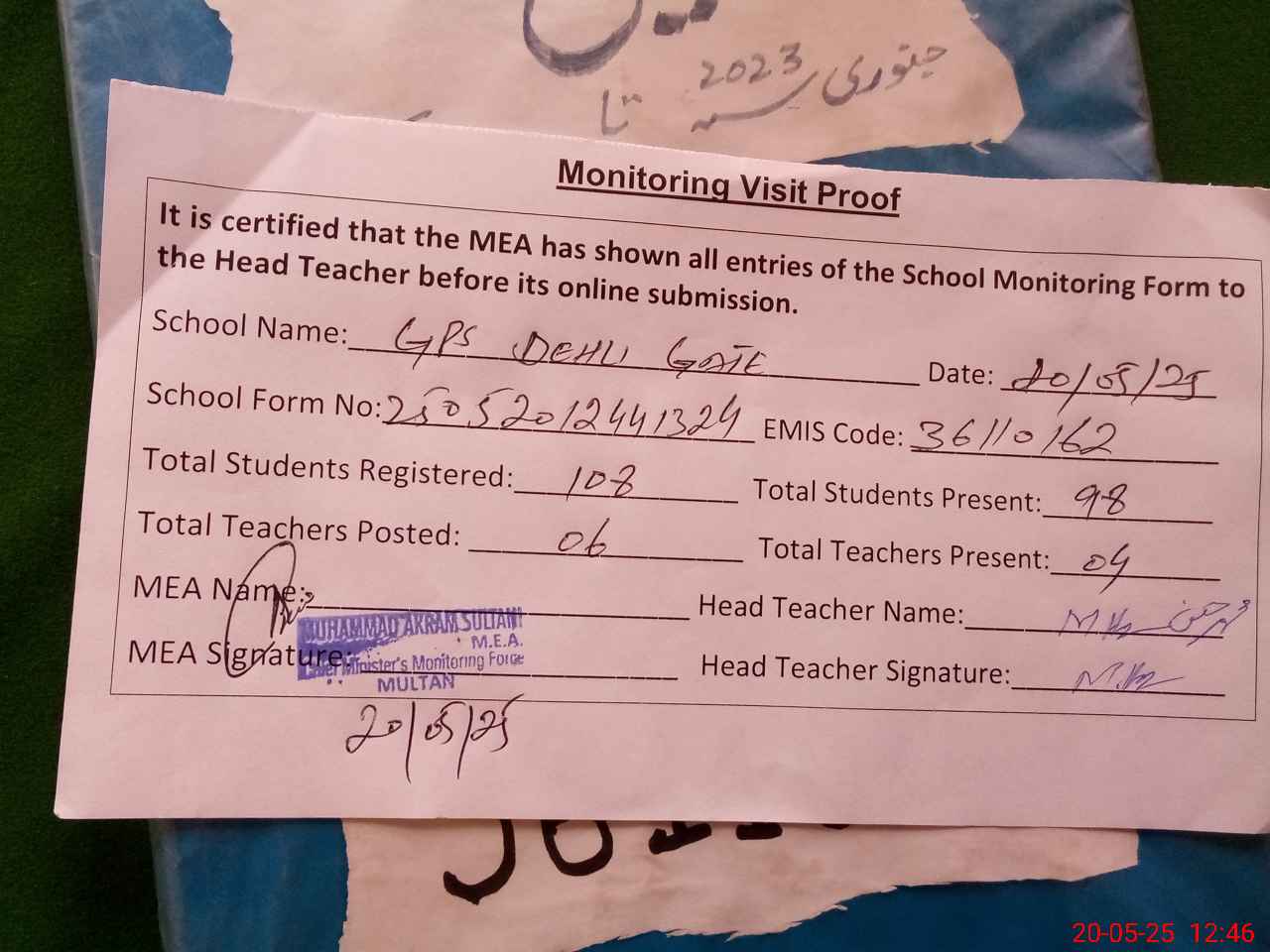 | EMIS Code: 36110162 | Name of School: GPS MC DEHLI GATE MULTAN | |||