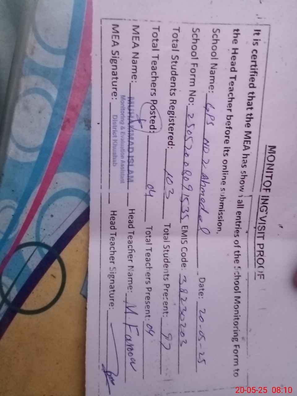 | EMIS Code: 38230203 | Name of School: GPS NO. 2 AHMEDAL | |||