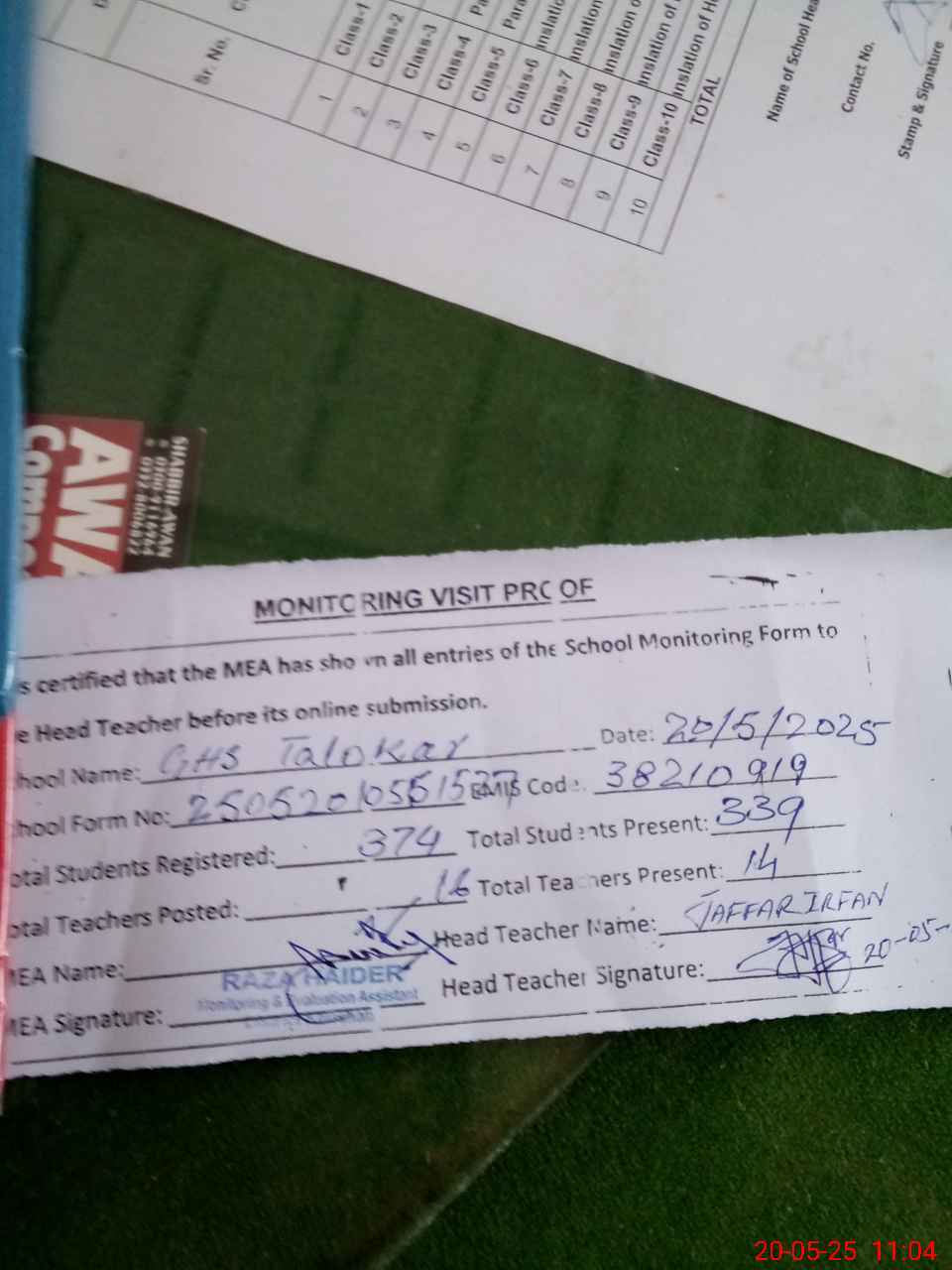 | Attendance Register | Head Teacher | MEA with School | Visit Proof |