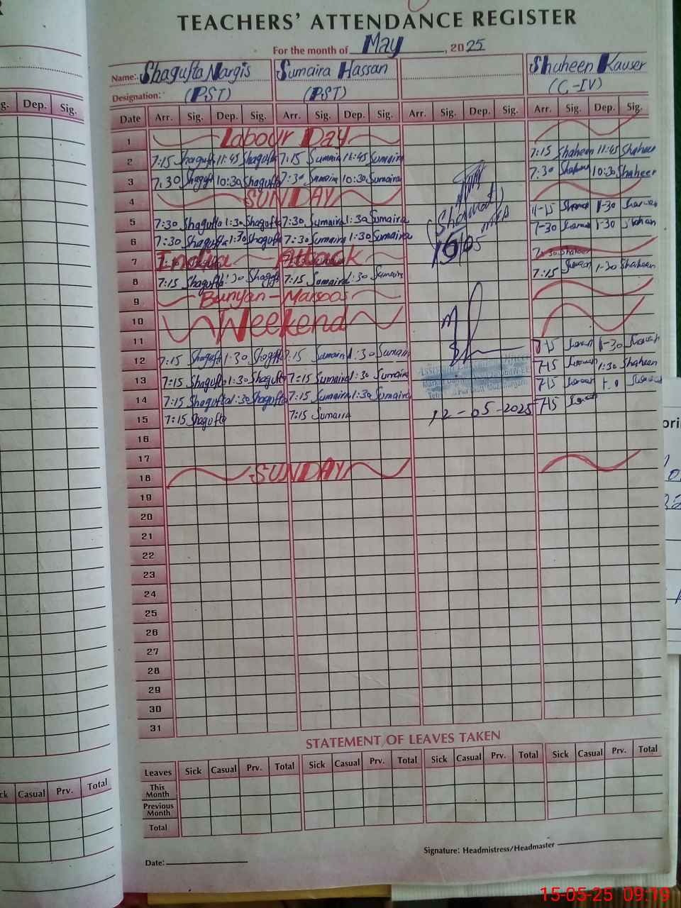 | Monitoring Date: 15-05-2025 | Start Time: 15-05-2025 09:16 AM | End Time: 15-05-2025 09:59 AM | Name of MEA: SH**** HU**** | |