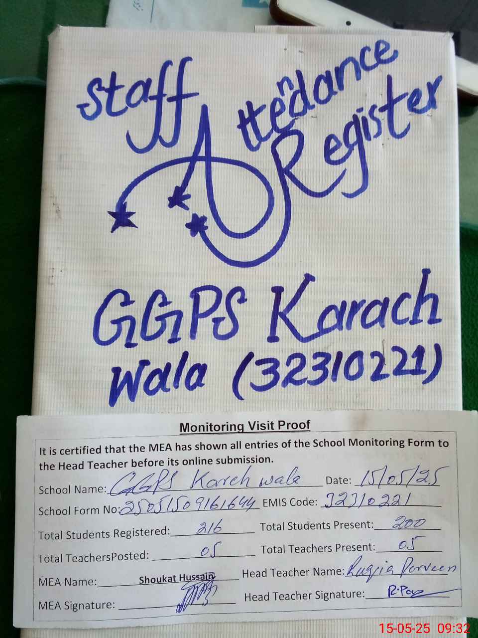 | Attendance Register | Head Teacher | MEA with School | Visit Proof |