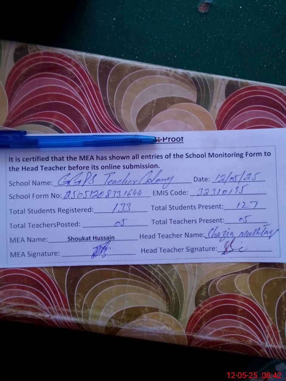 | Attendance Register | Head Teacher | MEA with School | Visit Proof |