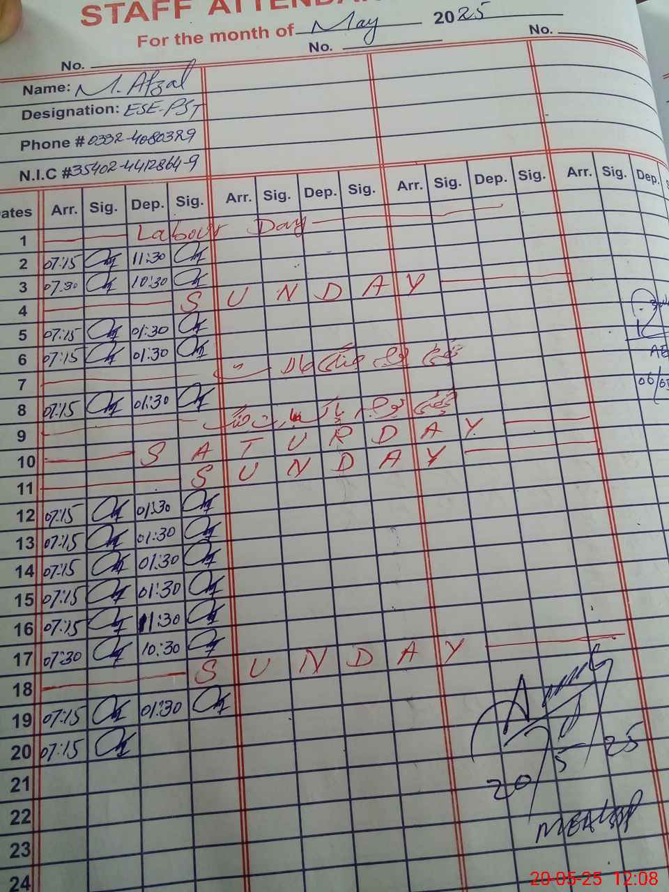 | CNIC | Full Name | Designation | R/C | Absence during last cal. month |