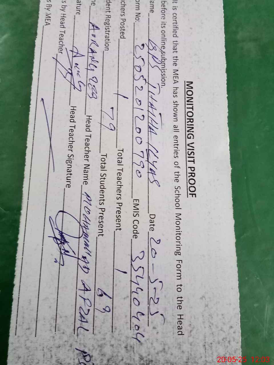 | Attendance Register | Head Teacher | MEA with School | Visit Proof |