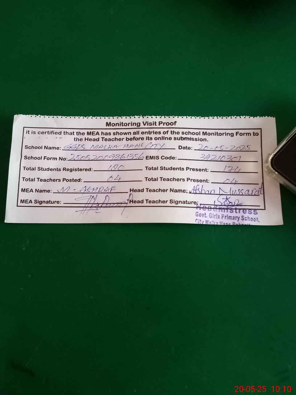 | Attendance Register | Head Teacher | MEA with School | Visit Proof |