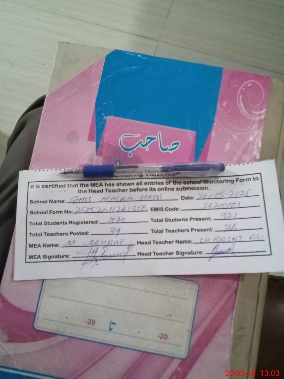 | Attendance Register | Head Teacher | MEA with School | Visit Proof |