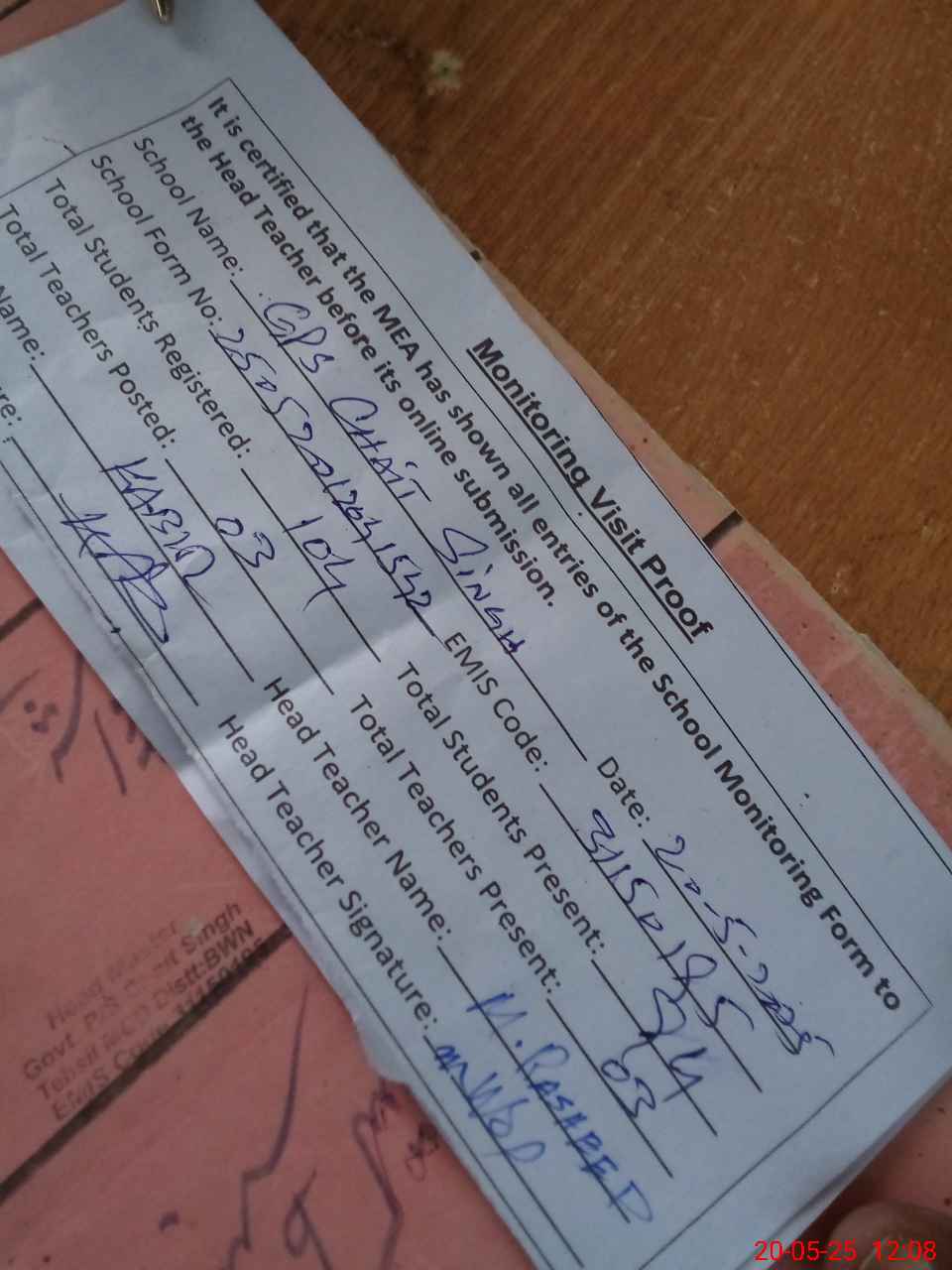 | Attendance Register | Head Teacher | MEA with School | Visit Proof |