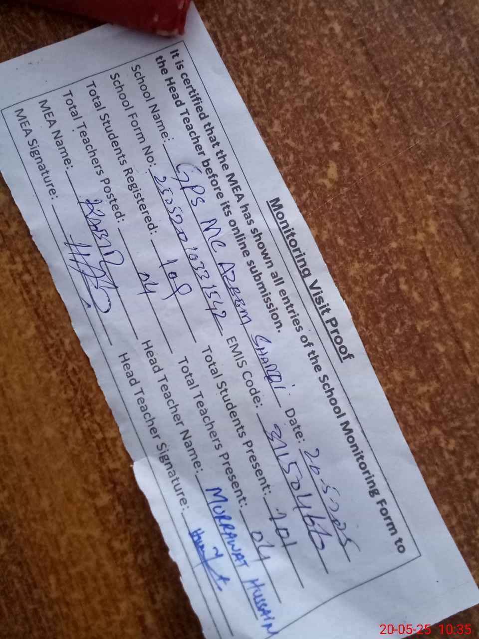 | Attendance Register | Head Teacher | MEA with School | Visit Proof |