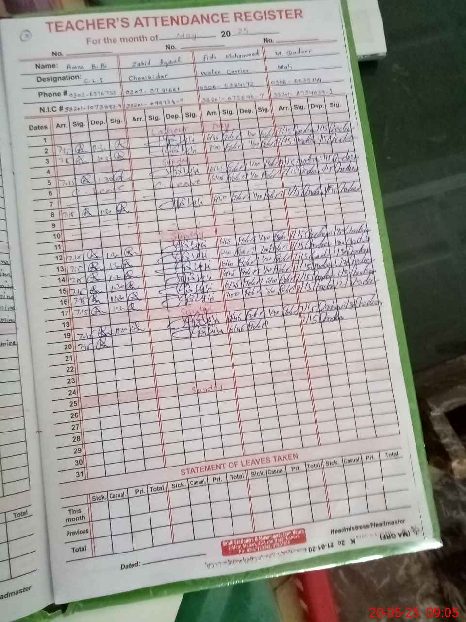 | CNIC | Full Name | Designation | R/C | Absence During Last Calender Month |