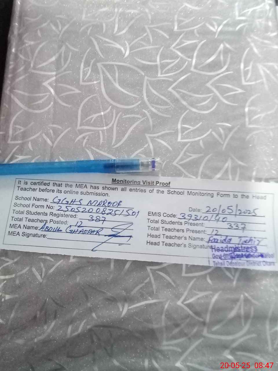 | Attendance Register | Head Teacher | MEA with School | Visit Proof |