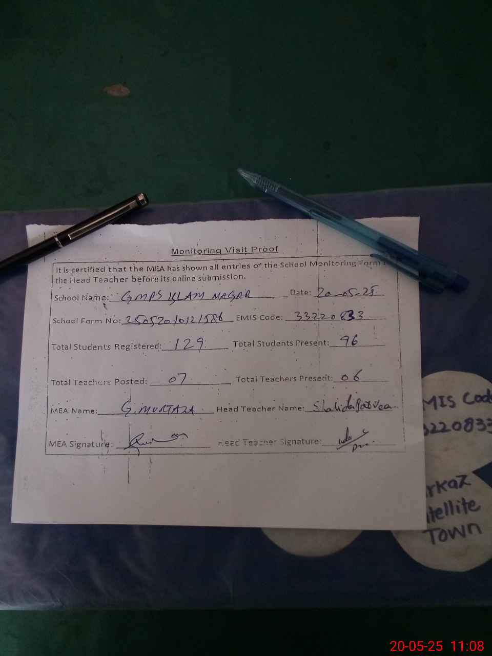 | Attendance Register | Head Teacher | MEA with School | Visit Proof |