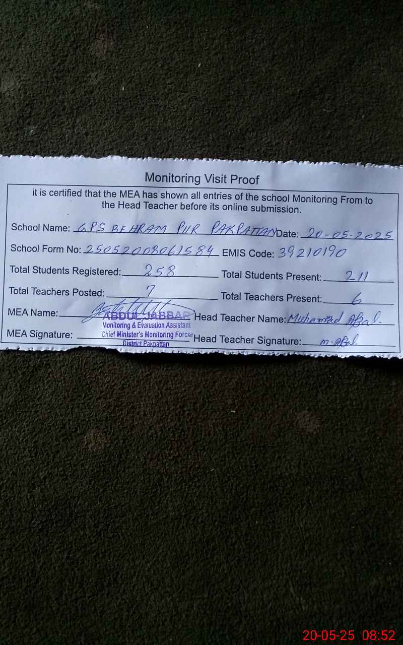 | EMIS Code: 39210190 | Name of School: GPS BEHRAM PUR PO PAKPATTAN | |||