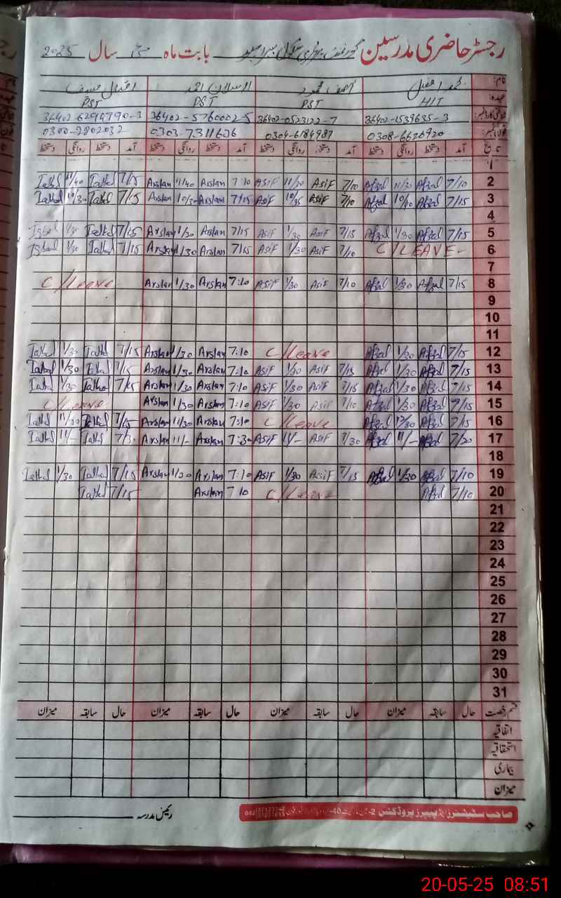 | CNIC | Full Name | Designation | R/C | Absence During Last Calender Month |