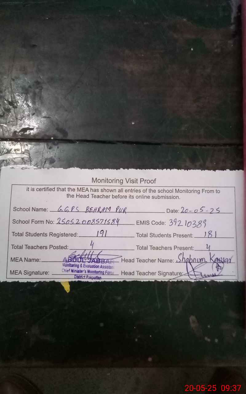 | EMIS Code: 39210389 | Name of School: GGPS BEHRAM PUR | |||