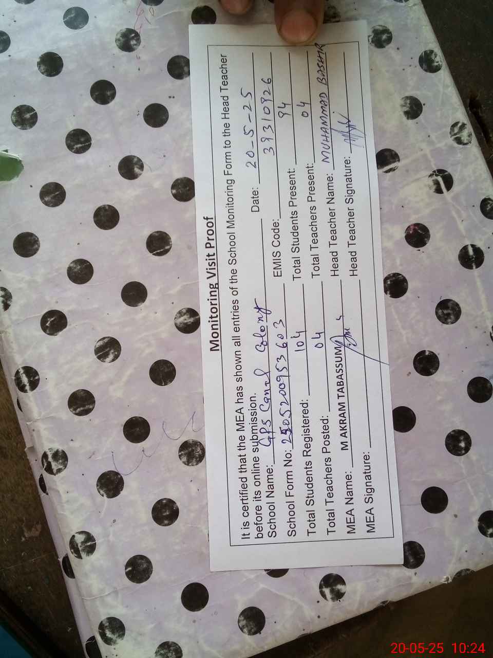 | Certified that this School was Inspected by the Undersigned MEA/DMO Today and the Information Stated Above is as Per Record. | |||||