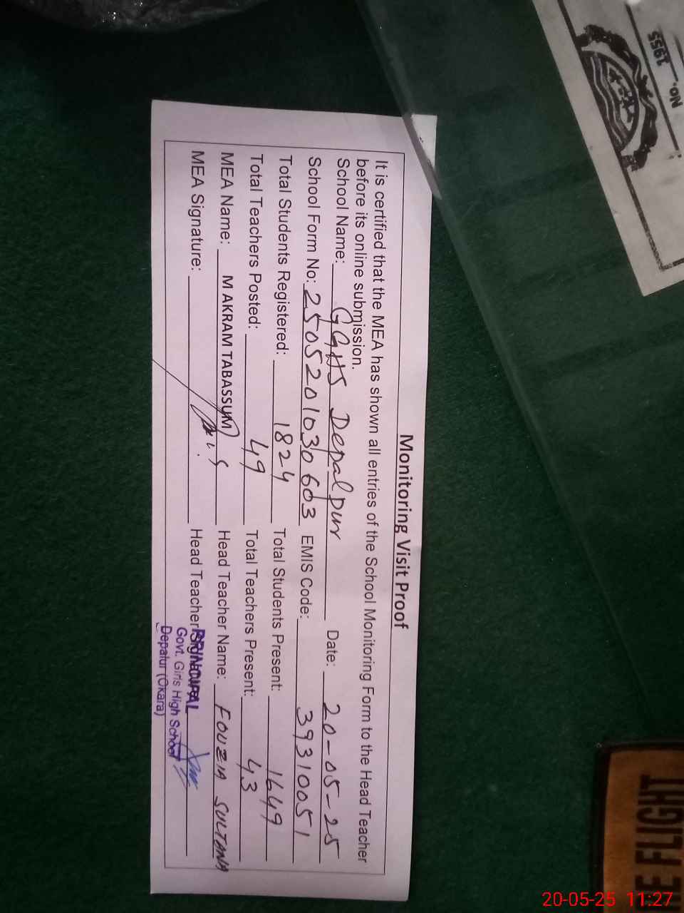 | Certified that this School was Inspected by the Undersigned MEA/DMO Today and the Information Stated Above is as Per Record. | |||||