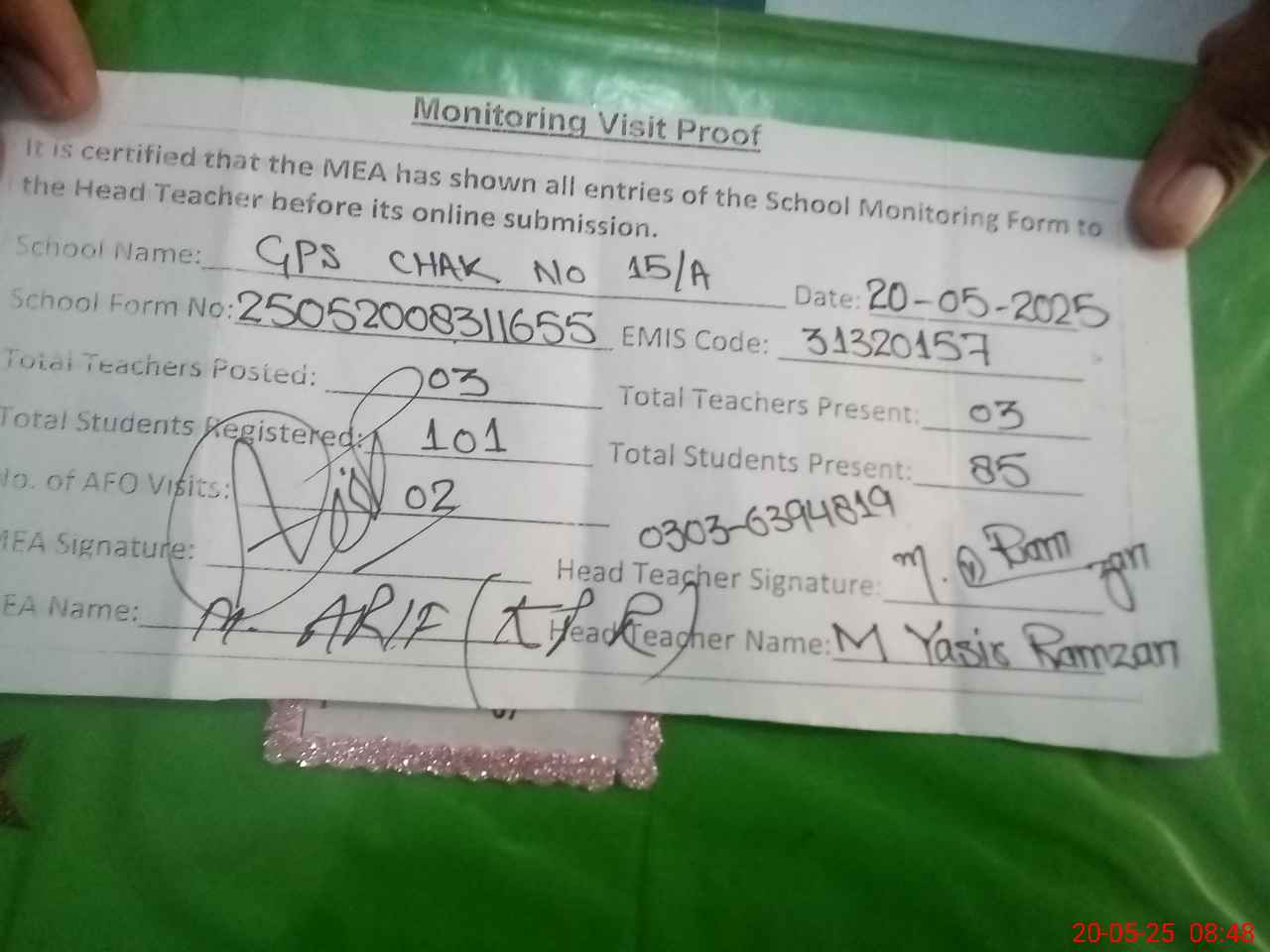 | EMIS Code: 31320157 | Name of School: GPS CHAK 15/A | |||