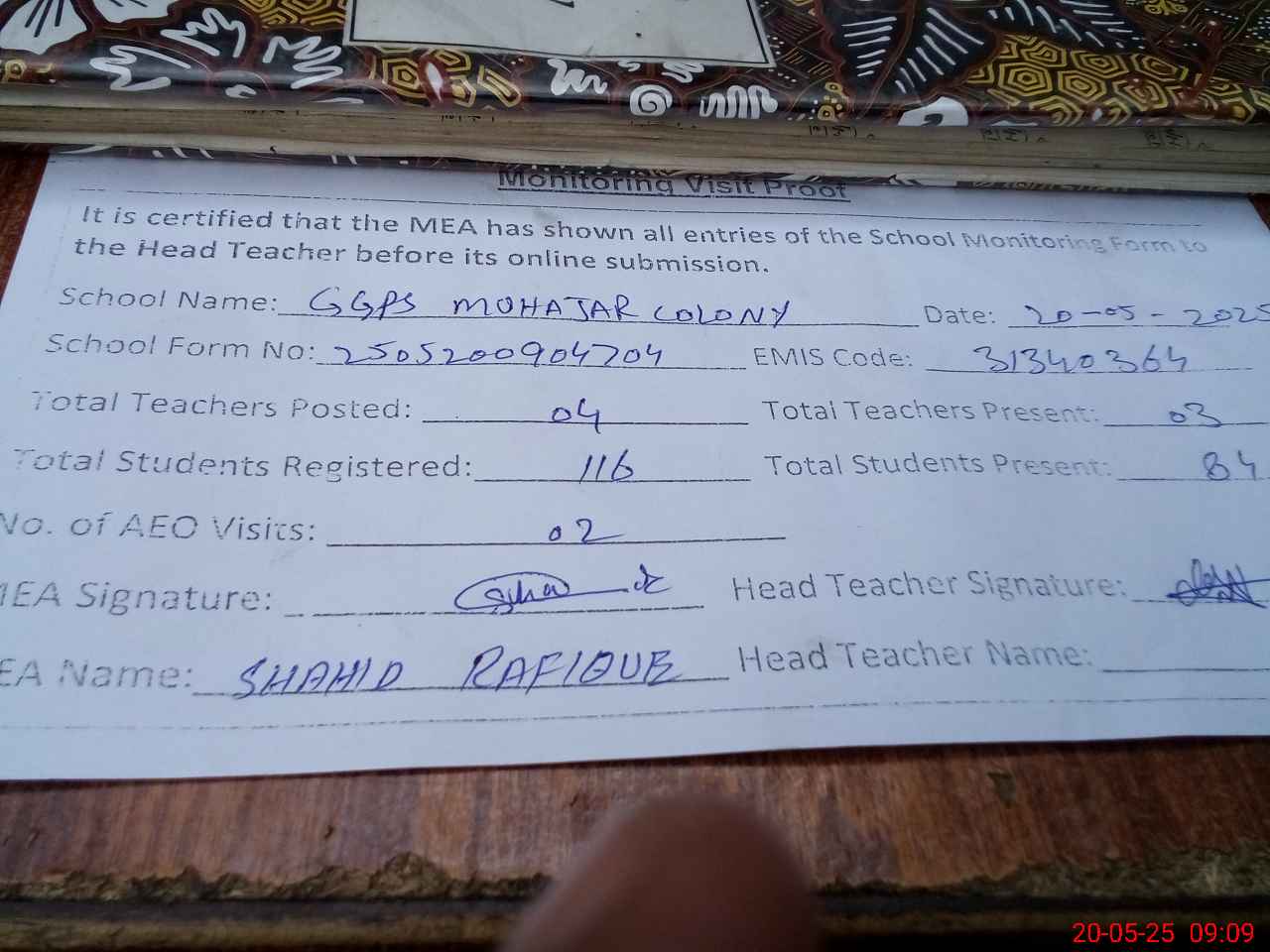| Attendance Register | Head Teacher | MEA with School | Visit Proof |
