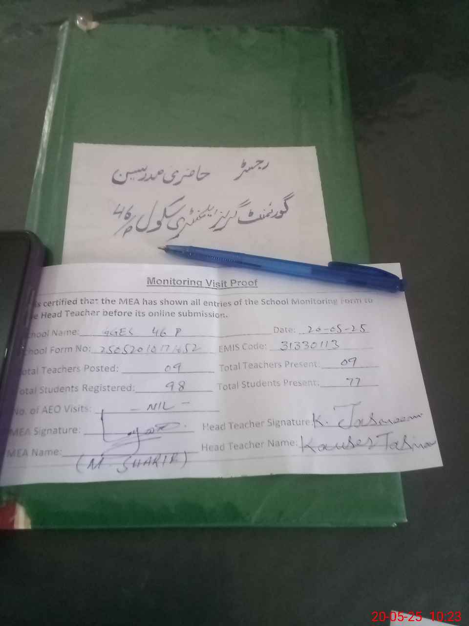 | Attendance Register | Head Teacher | MEA with School | Visit Proof |