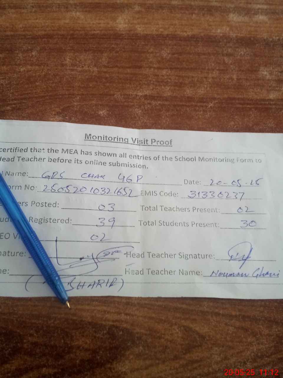 | Attendance Register | Head Teacher | MEA with School | Visit Proof |