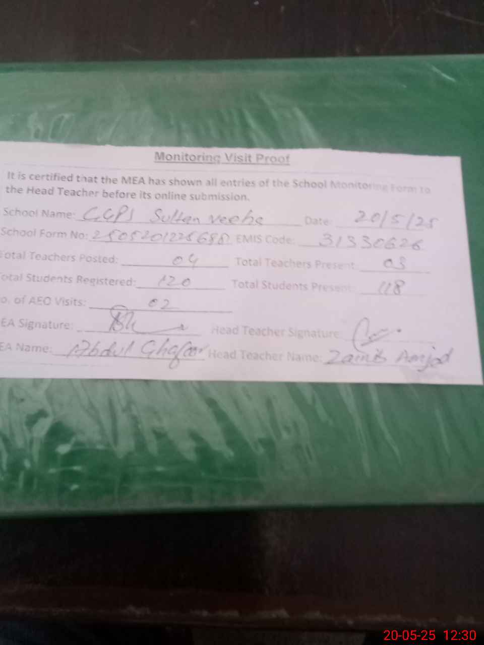 | Attendance Register | Head Teacher | MEA with School | Visit Proof |
