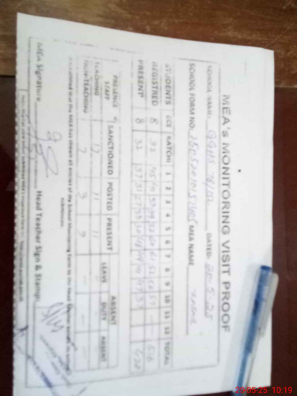 | Attendance Register | Head Teacher | MEA with School | Visit Proof |