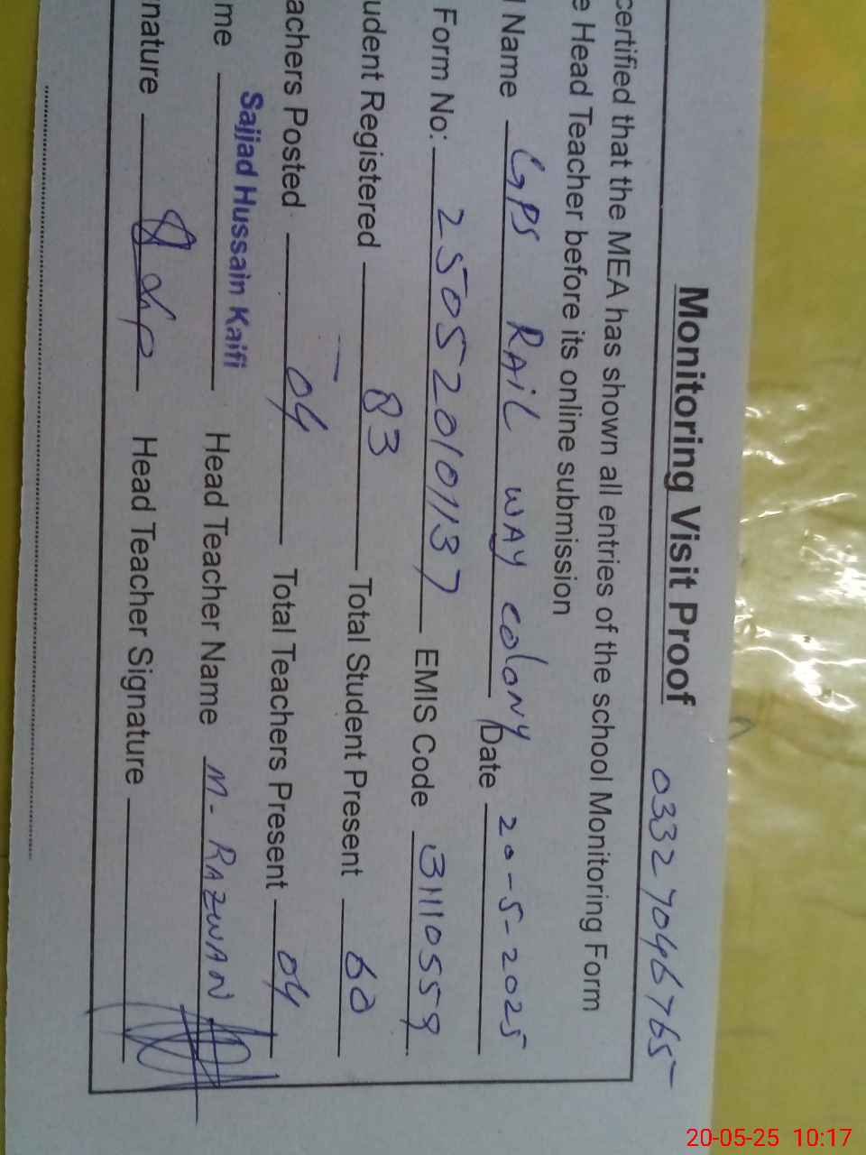 | EMIS Code: 31110559 | Name of School: GPS RAILWAY COLONY | |||