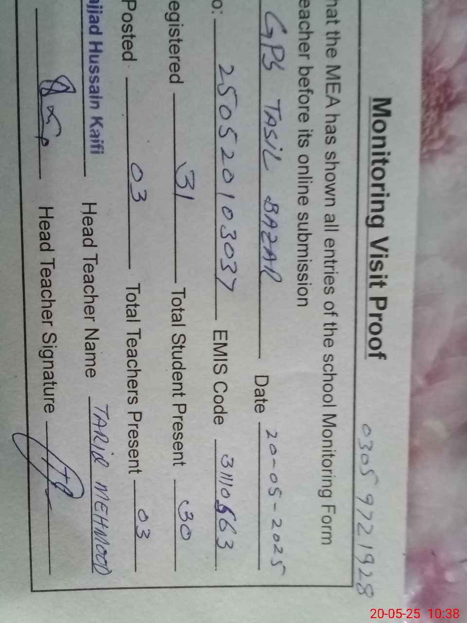 | Name: TA**** ME**** Designation: (School Headmaster's/Headmistress's) PST Phone/Cell Number: 03**** |