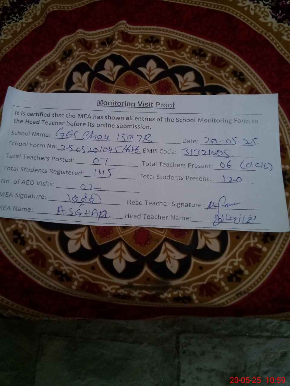 | Attendance Register | Head Teacher | MEA with School | Visit Proof |