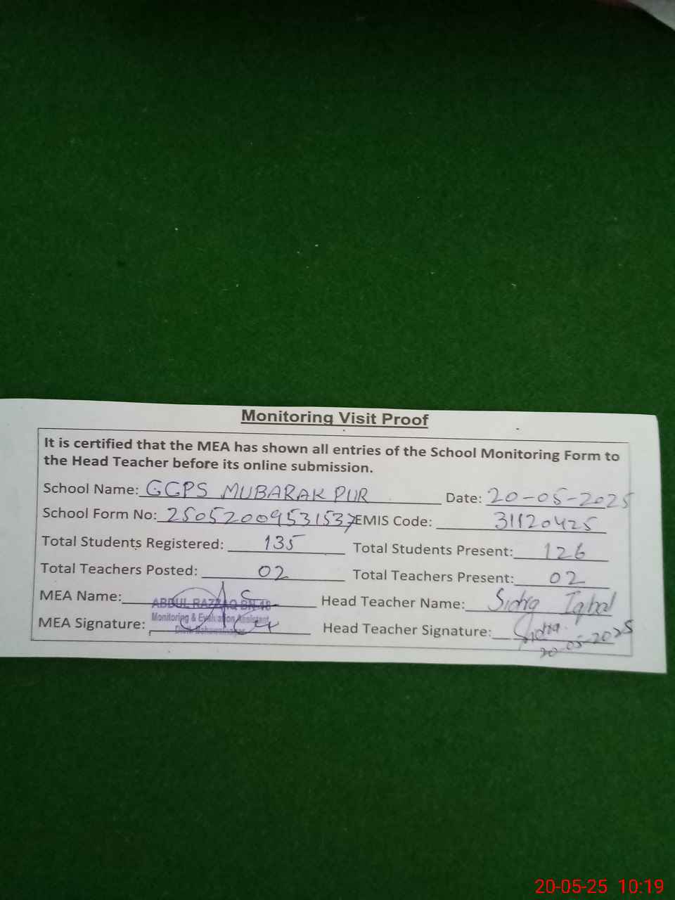 | EMIS Code: 31120425 | Name of School: GGPS MUBARAK PUR | |||