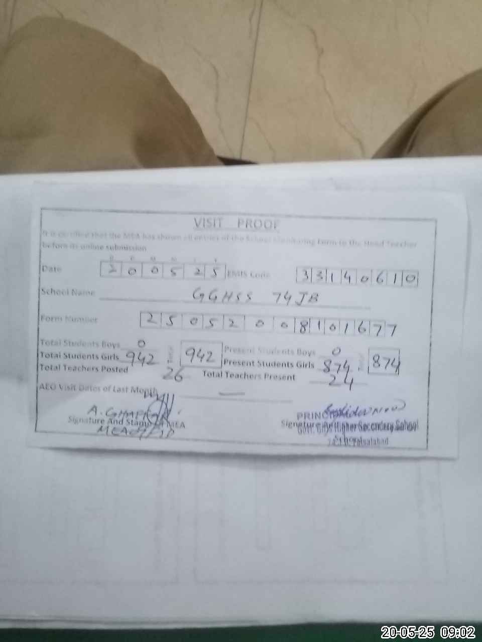 | Attendance Register | Head Teacher | MEA with School | Visit Proof |