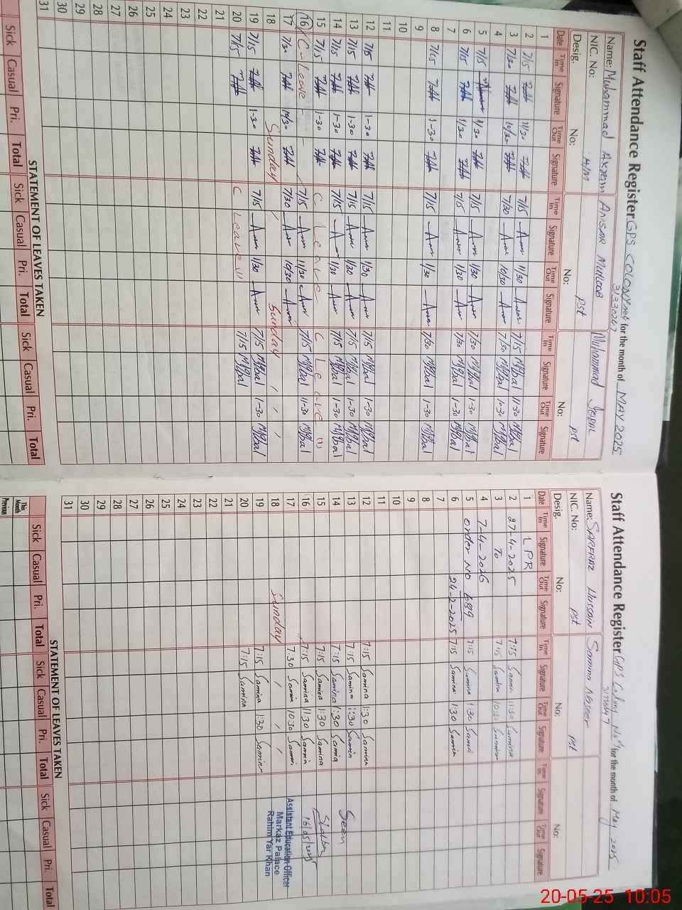 | CNIC | Full Name | Designation | R/C | Absence During Last Calender Month |