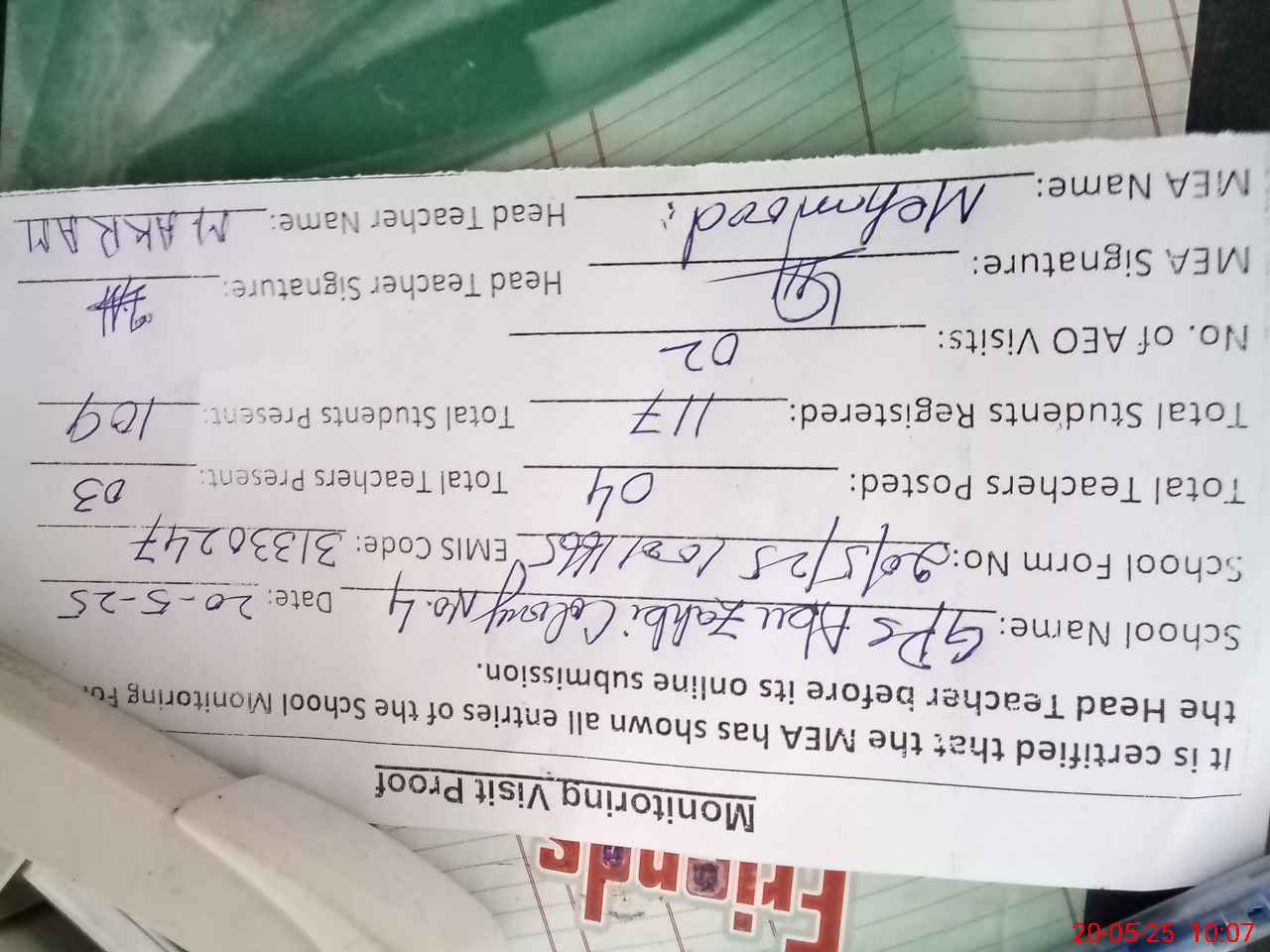 | Attendance Register | Head Teacher | MEA with School | Visit Proof |