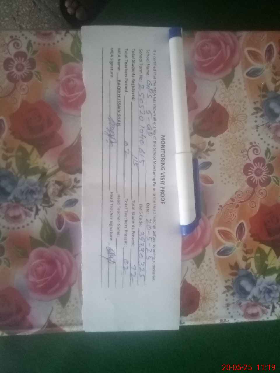 | Attendance Register | Head Teacher | MEA with School | Visit Proof |