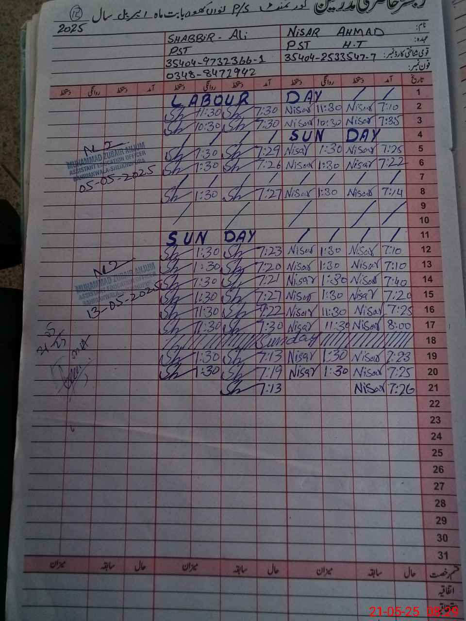 | CNIC | Full Name | Designation | R/C | Absence During Last Calender Month |